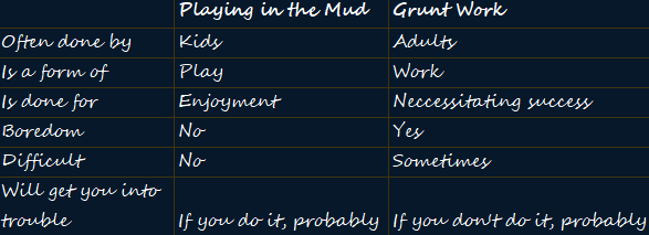 Playing in the mud and doing grunt work are not exactly opposites, but they are far apart enough to be juxtaposed as such. You could probably table their differences like so: