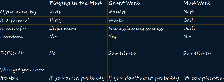For starters, I don’t think of it as doing grunt work, but “playing in the mud” or “doing mud work”. It is some sort of hybrid between the two: work that is also play, can be done by adults or kids, for enjoyment but also to facilitate success, and if you do or don’t do it, whether you get in trouble depends on your specific situation. Here is how it all fits in our table.