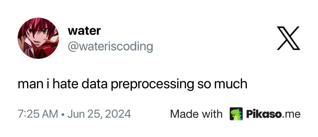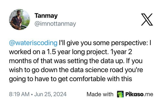 What no one tells you about quantitative work, is how much time you will spend doing data pre-processing. I saw someone tweet about it the other day.