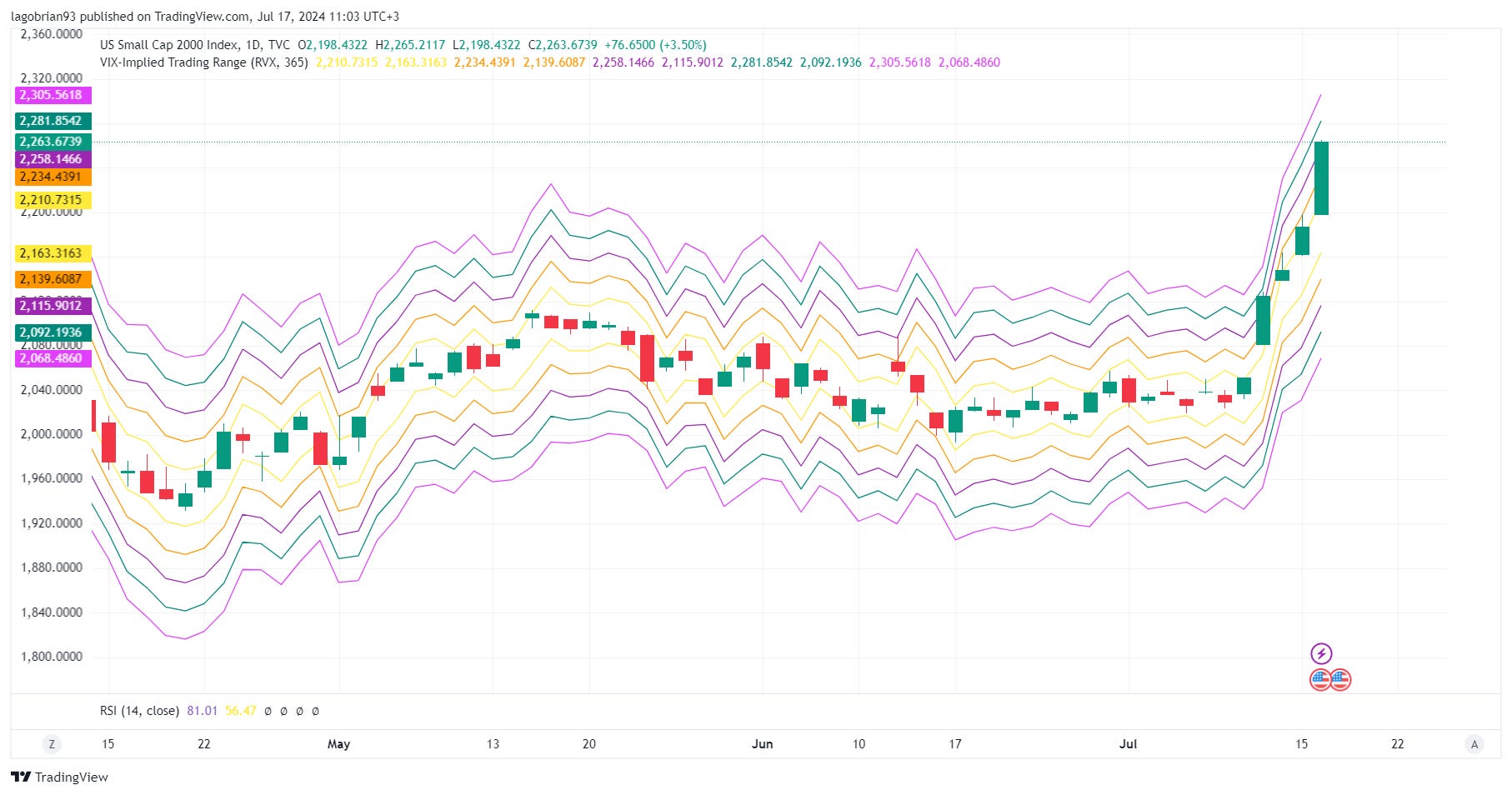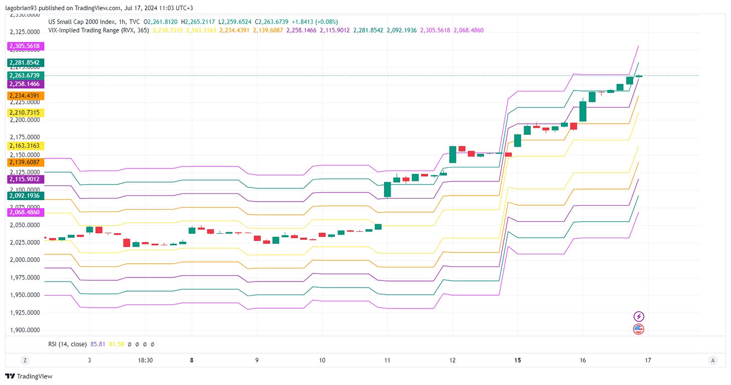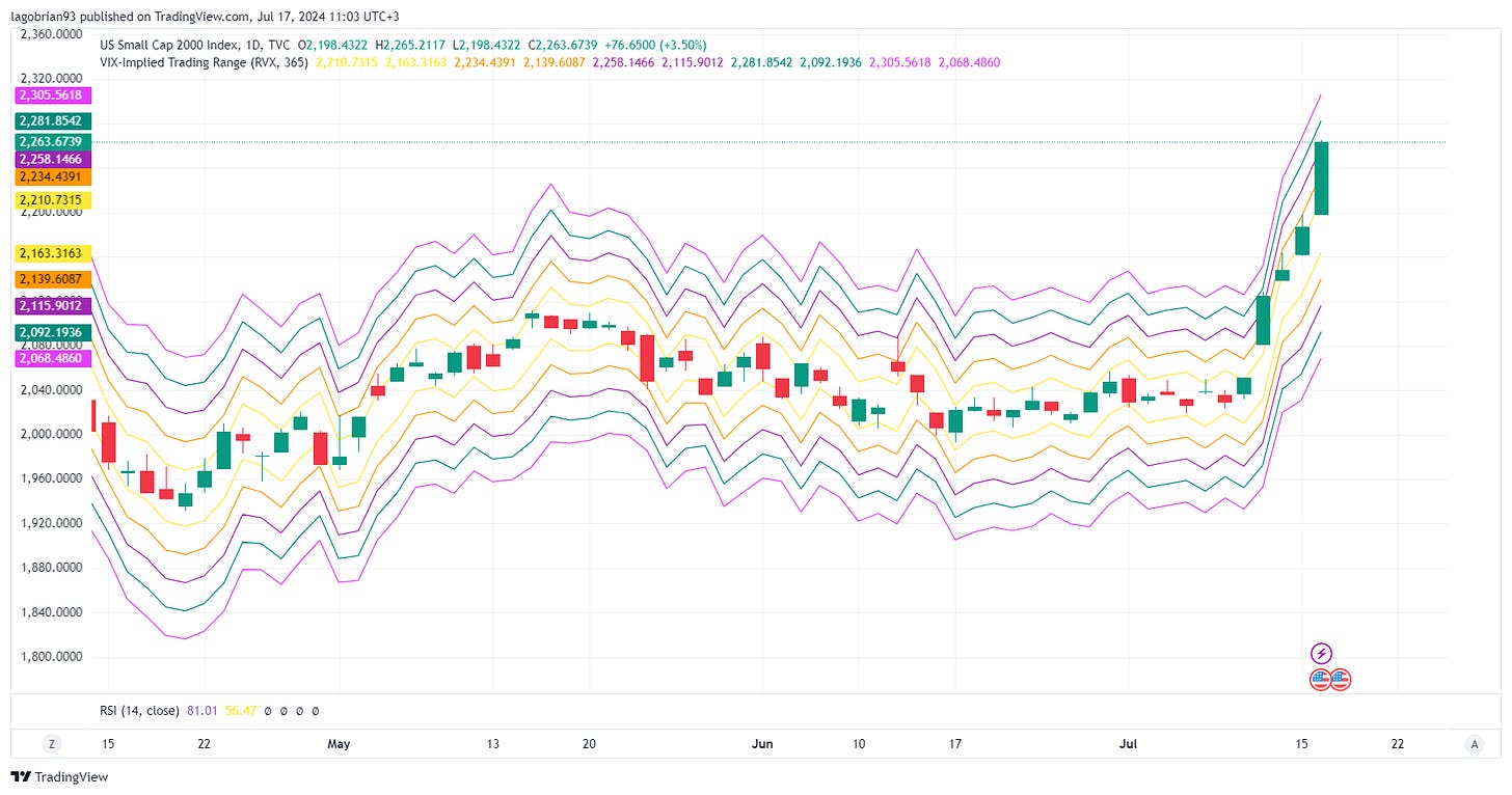 The Russell 2000 is 4 standard deviations above the RVX implied range! Reversal today?