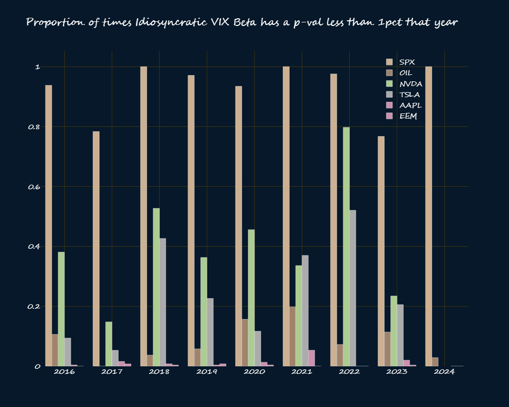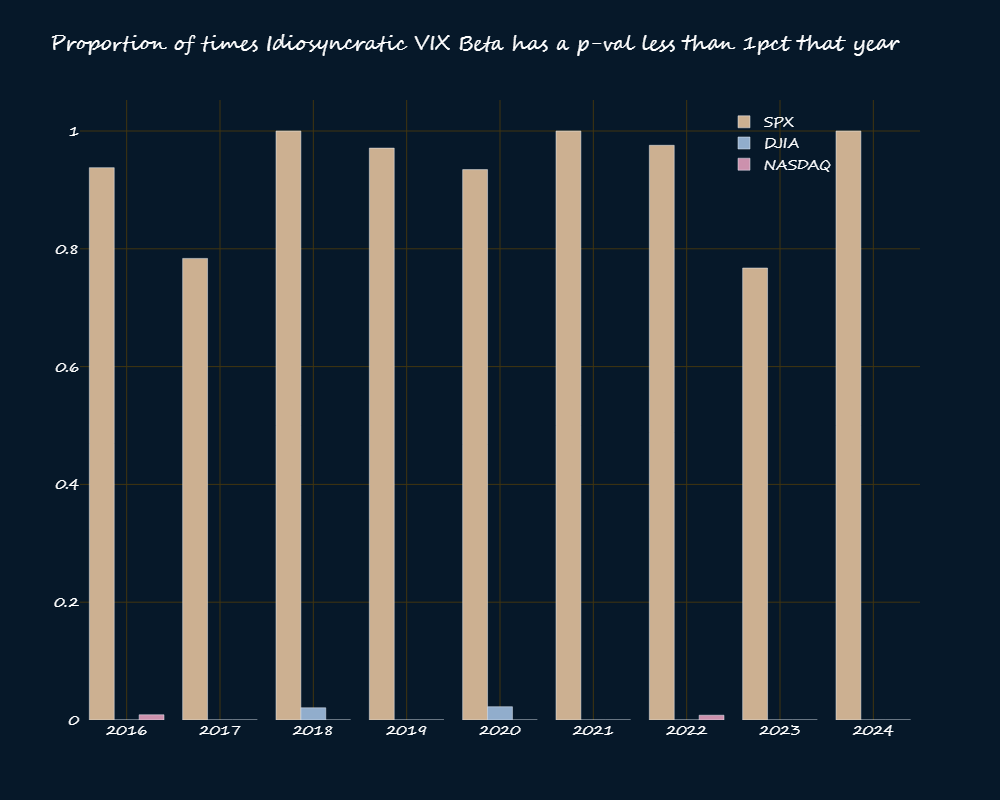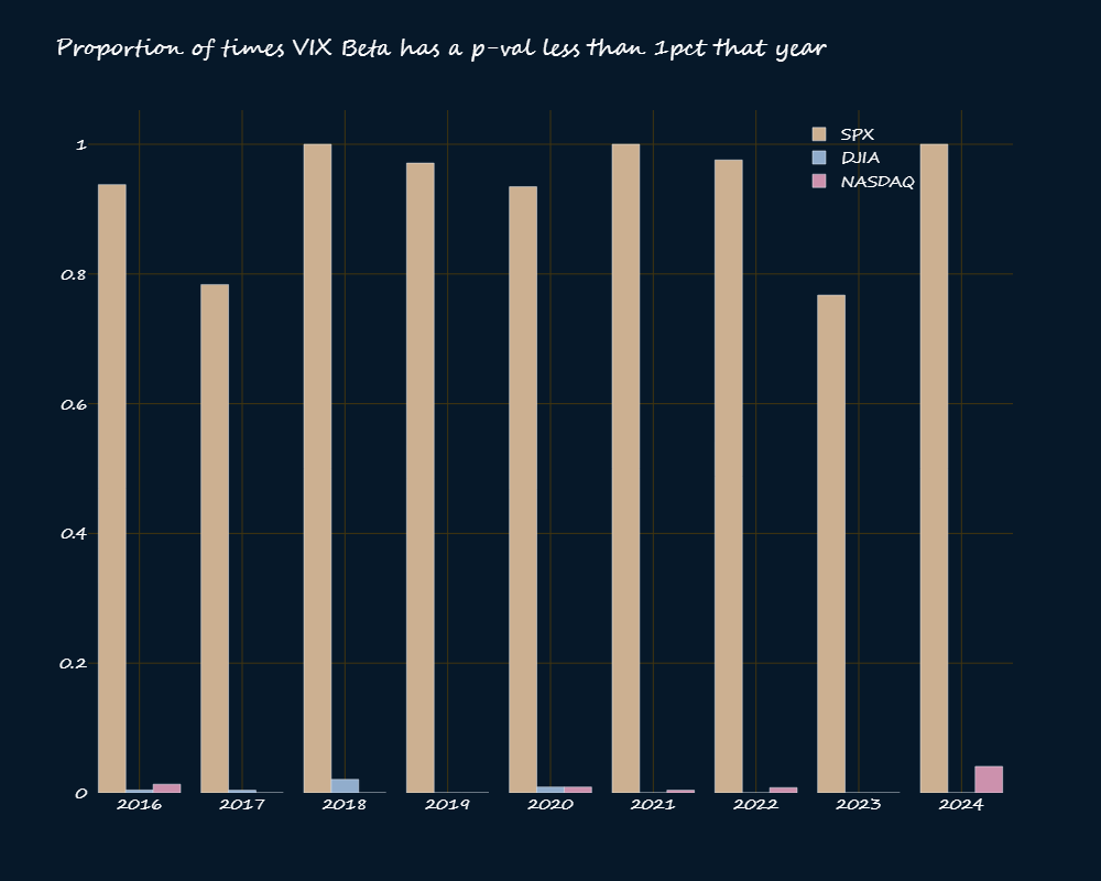I also checked the proportion of times the regression betas had a p-val less than 1%. For the SPX, the number was almost always north of 90%. You can say that nearly all the time, the VIX is being used to hedge. But the same can’t be said of the Dow or the Nasdaq. Mind you, these are their idiosyncratic vol indices (VXD and VXN, respectively)