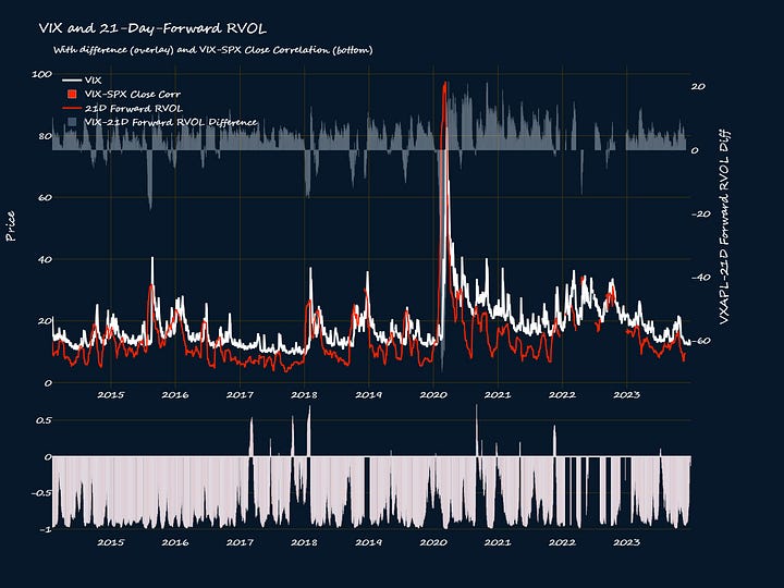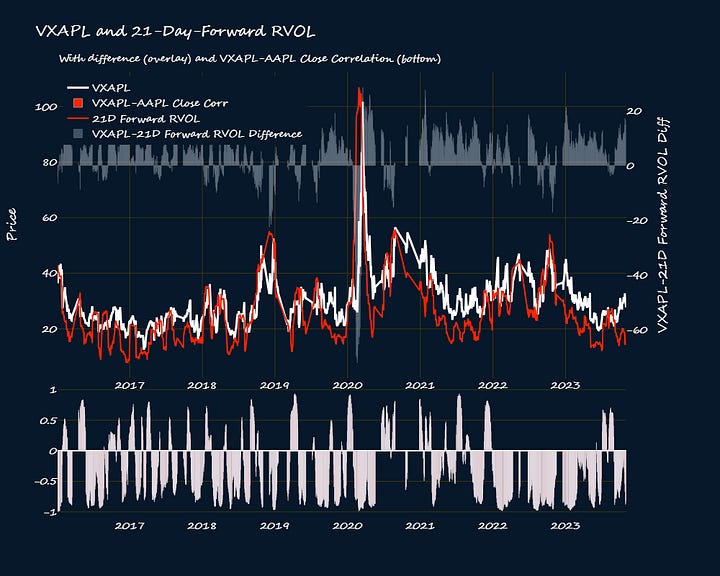 The bottom panel of the above two plots shows 21-day rolling correlations between the underlying and the volatility index. So VIX vs SPX correlation and AAPL vs VXAPL correlation. Notice how for VIX-SPX the correlations were almost always negative even though there are a few times when it was actually positive. Then for VXAPL - AAPL, there are more times when the correlation is positive. I think it’s safe to say that this is because you expect more hedging in the index than the equity.