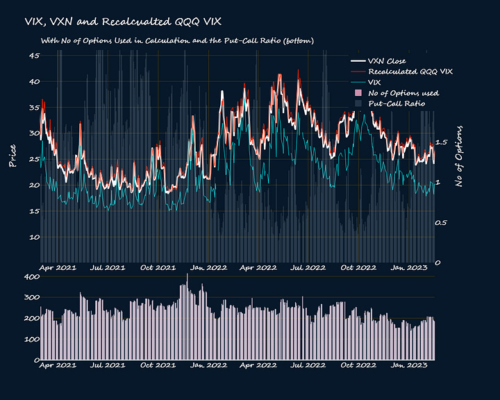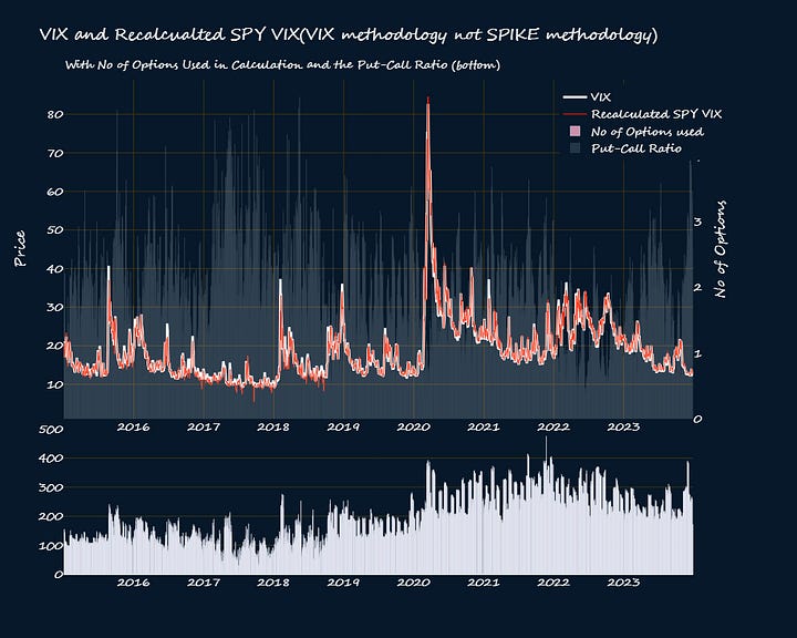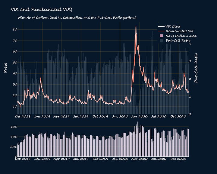 That argument really got me thinking which is why in the last post, I added put-call ratios and the number of options used to calculate the VIX. If indeed the VIX measures this kind of utility, the VIX should have an inverse relationship with the put-call ratio… and it does. Here are some of the chart that show this: VIX (white), Recalculated VIX (red), number of options (bottom) and put-call ratio (grey background).