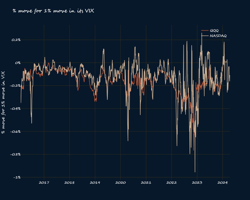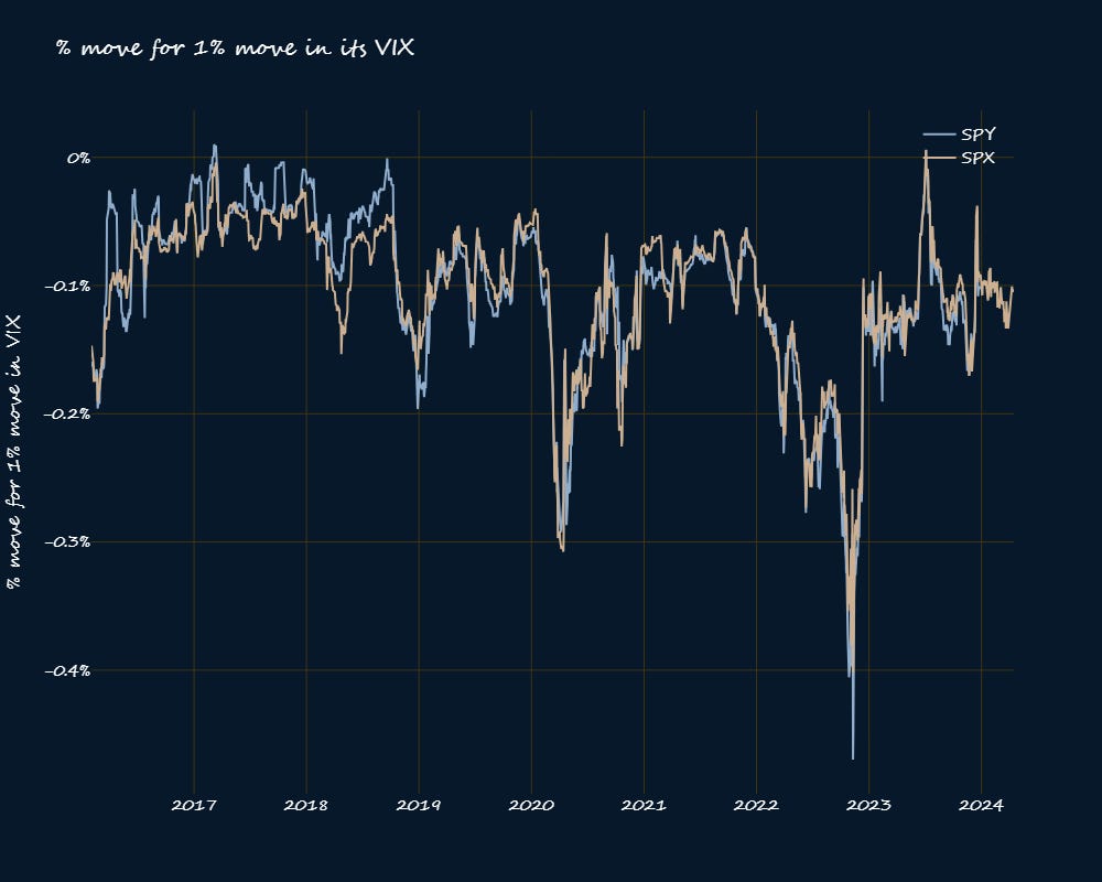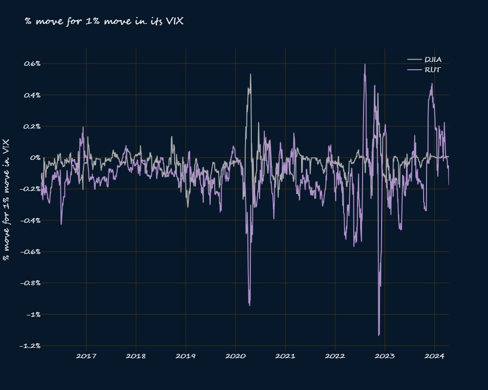 So indices are more sensitive to their VIX, but their sensitivities differ with the SPX being the most sympathetic to it’s VIX and Dow the least.