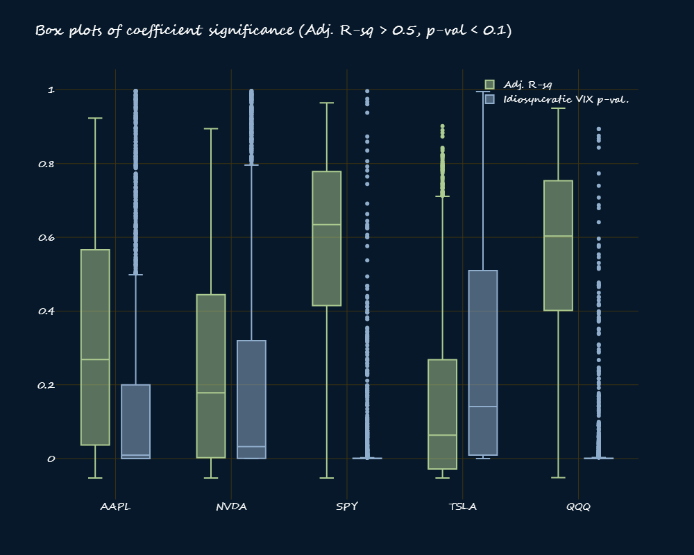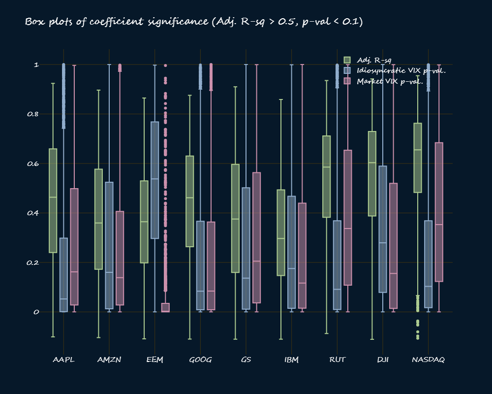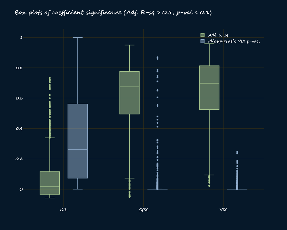 The box-plots show the significance the adj. R-squared (green), idiosyncratic VIX p-vals and market VIX p-vals.
