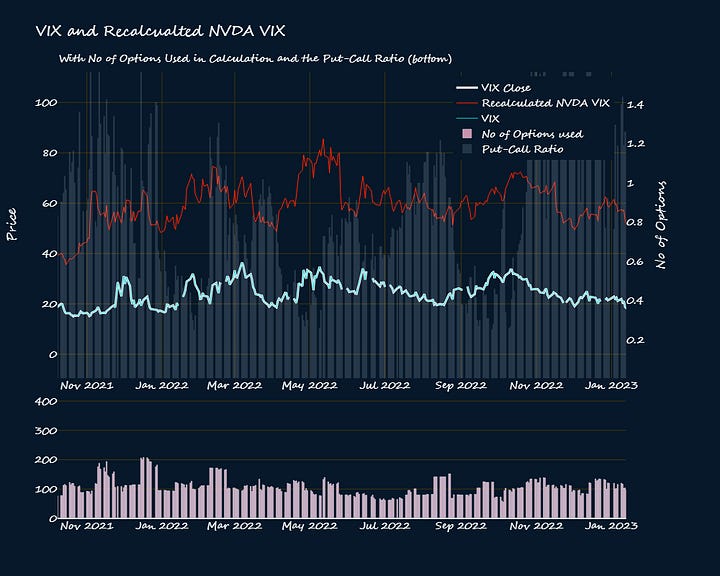 Notice that the PCR is almost always far above 1, but it goes below 1 when the VIX spikes. That’s because when the VIX spikes, and the market is going down, the only utility a risk-averse investor would need is if he is short and want’s to protect himself from an abrupt market recovery. Other risk averse investors would not buy downside insurance at this time as it would be too expensive. So the VIX is a fear gauge in the truest sense of the word: it captures whatever the most fearful investors are doing.